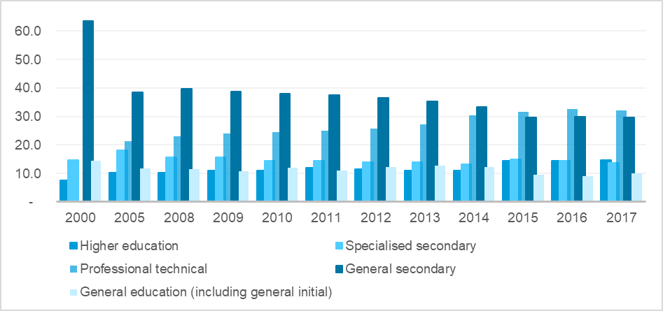 According to Article 14 of the Law on Education, the system is composed of pre-primary education, general secondary education, vocational technical education, secondary specialised education and higher education. In addition, the article covers teacher training, advanced training and retraining, and independent education. The ratio of specialised secondary and university students (120 and 298 respectively per 10,000 people as of 2018/2019 academic year), is higher than many EU member states.