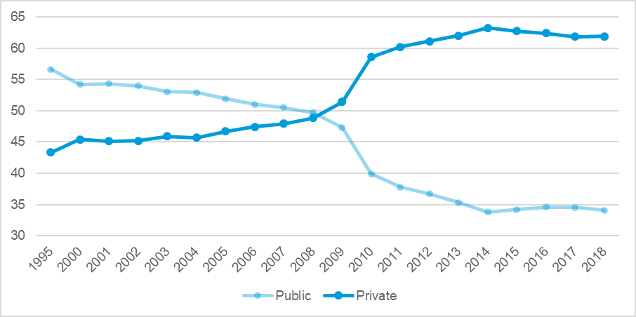 Secondary specialised and higher education can be obtained free of charge in state educational institutions on a competitive basis. In 2018/2019, the share of publicly funded students was 64% in secondary specialised and 44% in higher education indicating a high level of commercialisation of higher education. The principles and functions of education are further defined in the laws: "On Education in the Republic of Belarus," "On Languages," "On National and Cultural Minorities," "On the Child's Rights," as well as a number of statutes and regulations.
